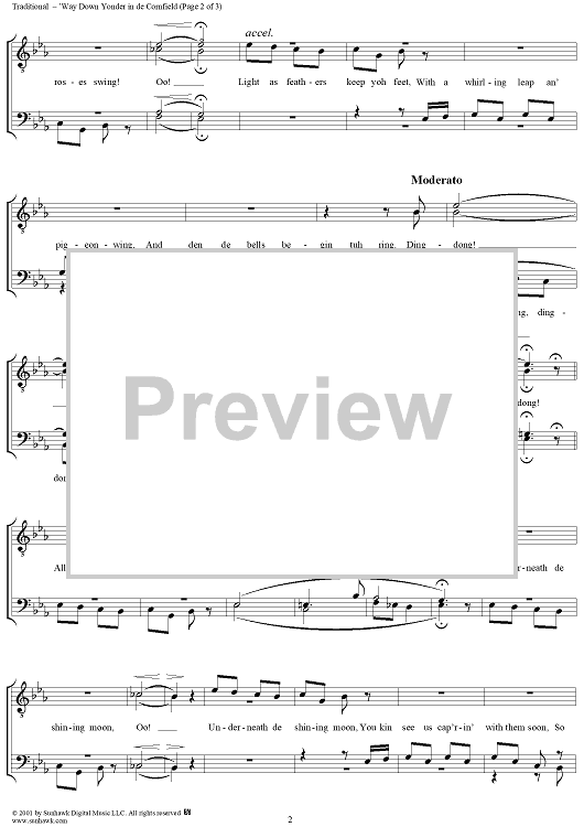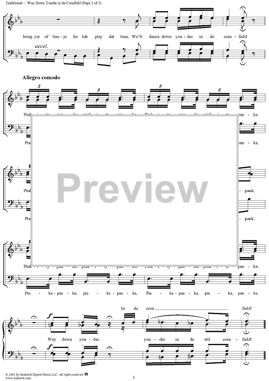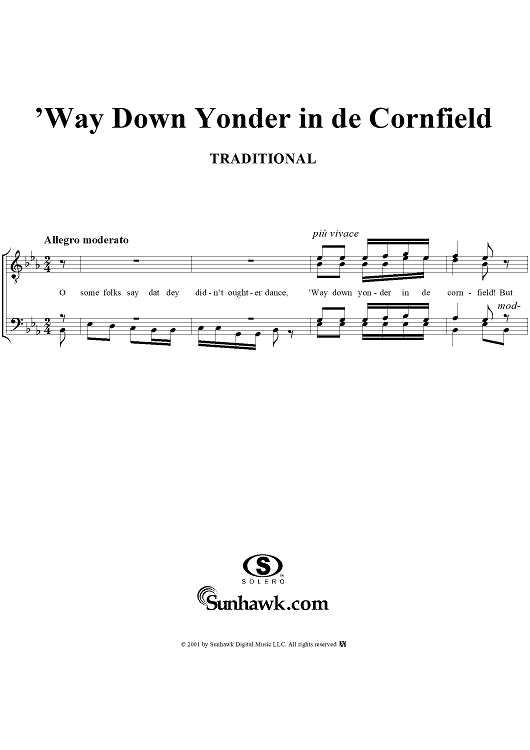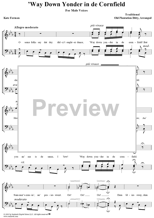 Digital Sheet Music for Way Downhere Yonder in de Cornfield by Kate Forman, Traditional scored for Four-part Mixed Chorus; id:278275
