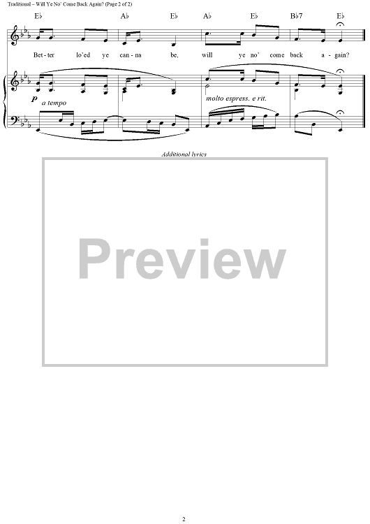Digital Sheet Music for Will Ye No' Come Back Again? by Norman Monath, Traditional scored for Piano/Vocal/Chords; id:262166