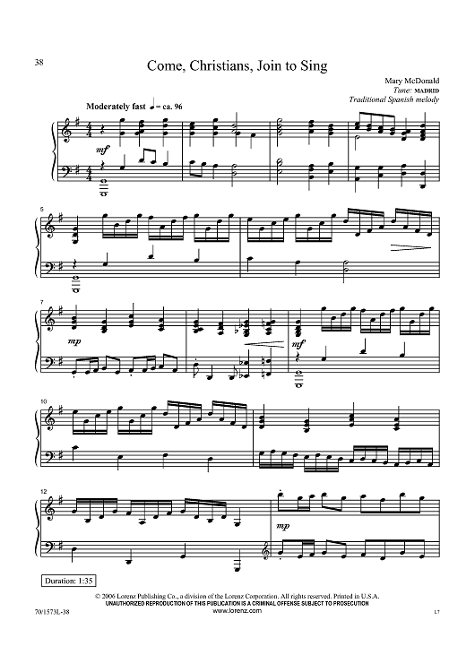 Digital Sheet Music for Come, Christians, Join to Sing by Traditional Spanish, Mary McDonald scored for Piano Solo; id:433430