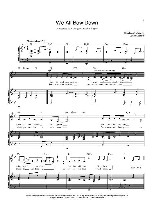 Digital Sheet Music for We All Bow Down by Twila Paris, Lenny LeBlanc scored for Piano/Vocal/Chords; id:388039