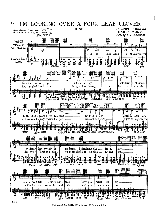 Digital Sheet Music for I'm Looking Over A Four Leaf Clover by , Mort Dixon, Harry Woods, E. T. Romeder scored for Ukulele; id:418667