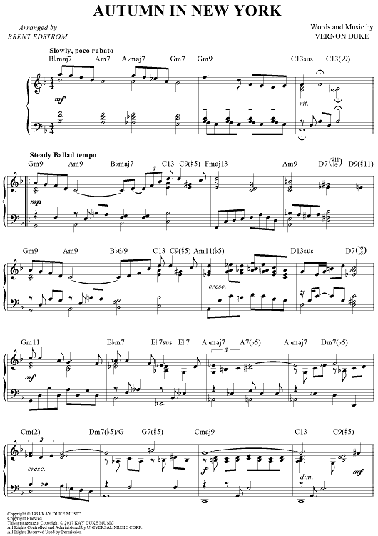 Digital Sheet Music for Autumn In New York by Vernon Duke, Brent Edstrom scored for Piano Solo; id:465455
