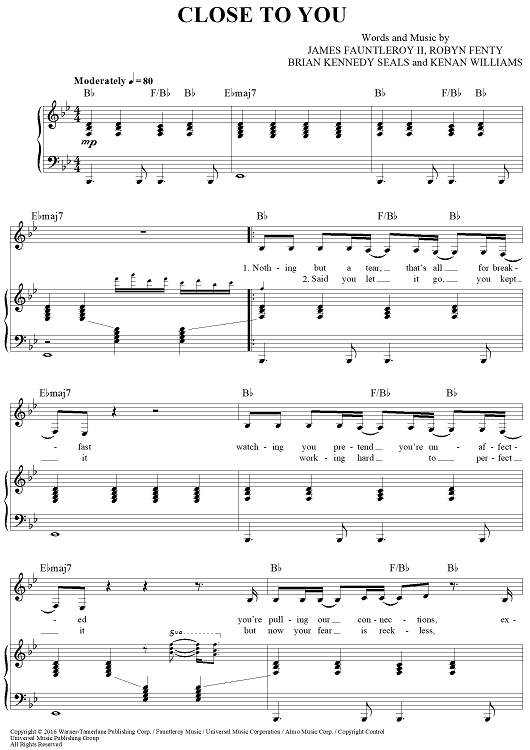 Digital Sheet Music for Close To You by Rihanna, Robyn Fenty, James Fauntleroy II, Brian Kennedy Seals, Kenan Williams scored for Piano/Vocal/Chords; id:456821