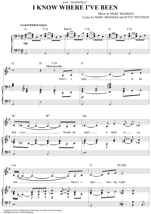 Digital Sheet Music for I Know Where I've Been by Marc Shaiman, Scott Wittman scored for Piano/Vocal/Chords; id:363077