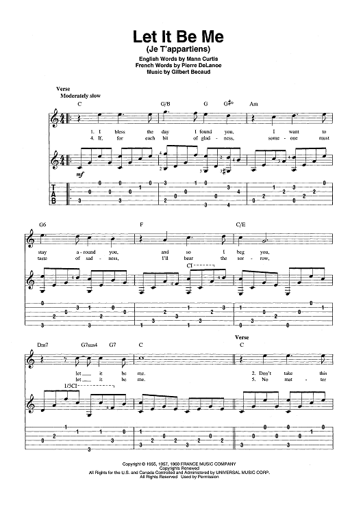 Digital Sheet Music for Let It Be Me (Je T'appartiens) by Mann Curtis, Gilbert Becaud, Pierre Delanoë scored for Guitar Tab/Vocal/Chords; id:442962