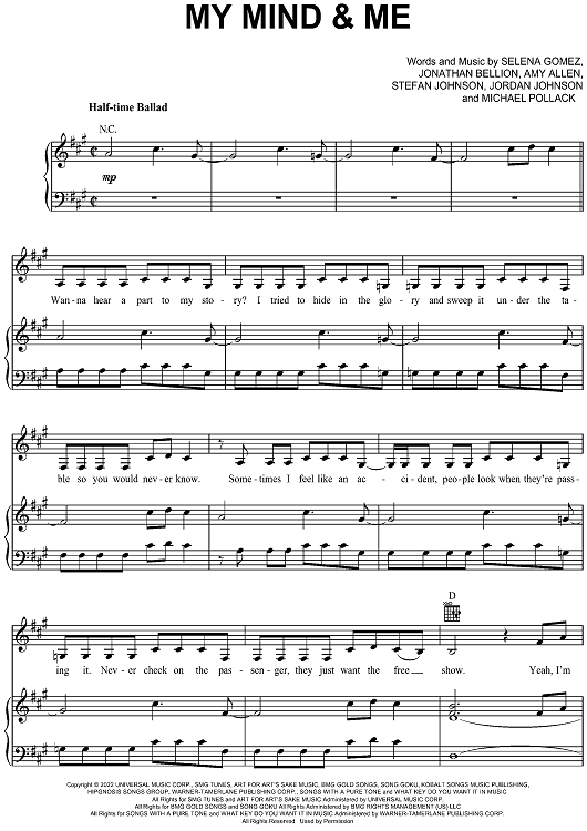 Digital Sheet Music for My Mind And Me by Selena Gomez, Jordan Johnson, Stefan Johnson, Jon Bellion, Michael Pollack, Amy Allen scored for Piano/Vocal/Chords; id:498242