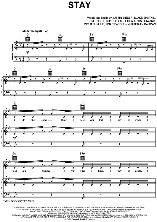 Digital Sheet Music for Stay by Justin Bieber, Charlie Puth, The Kid LAROI, Omer Fedi, Blake Shatkin, Michael Mule, Isaac DeBoni, Subhaan Rahman scored for Piano/Vocal/Chords; id:469481