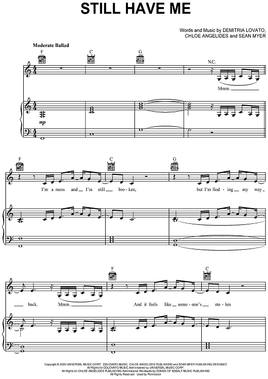 Digital Sheet Music for Still Have Me by Demi Lovato, Demitria Lovato, Chloe Angelides, Sean Myer scored for Piano/Vocal/Chords; id:468578