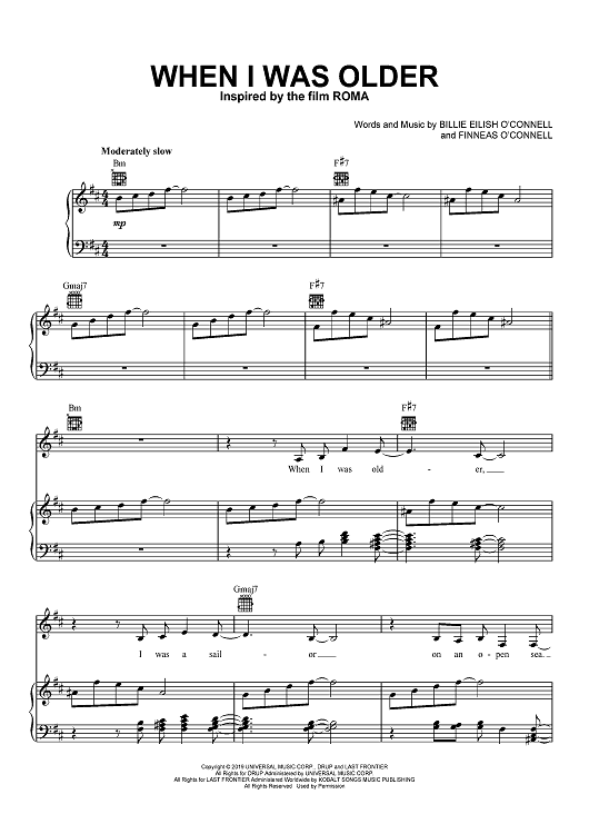 Digital Sheet Music for When I Was Older (Inspired by the film ROMA) by Finneas Baird O'Connell, Billie Eilish scored for Piano/Vocal/Chords; id:468049