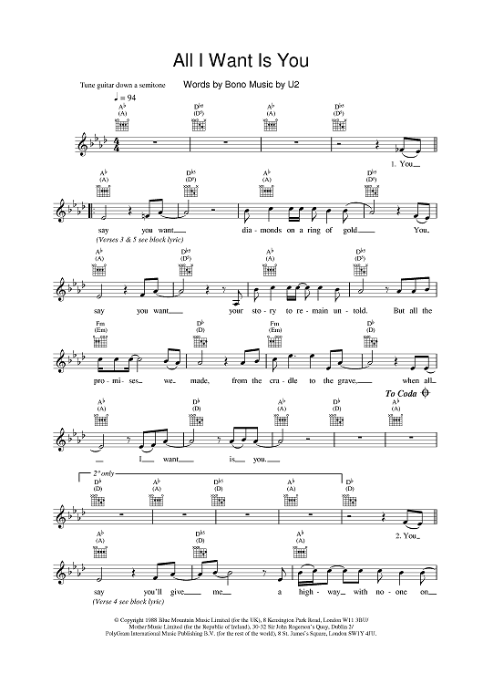 Digital Sheet Music for All I Want Is You by U2 scored for Lead Sheet; id:375628
