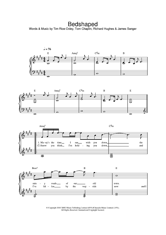 Digital Sheet Music for Bedshaped by Keane, Tim Rice-Oxley, Tom Chaplin, Richard David Hughes scored for Piano; id:380900