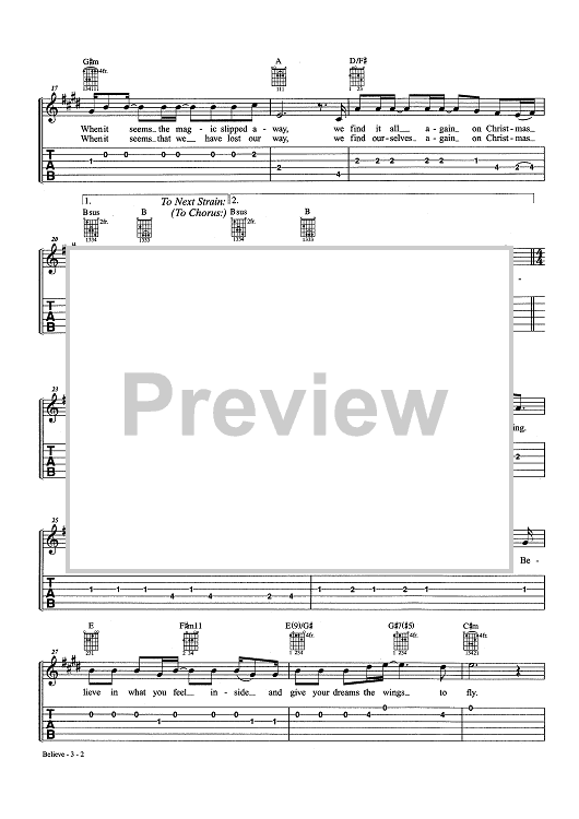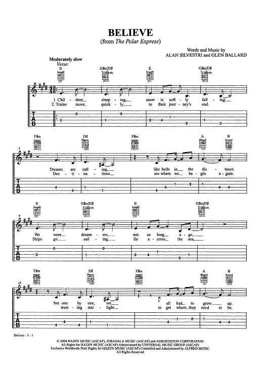 Digital Sheet Music for Believe by Glen Ballard, Alan Silvestri scored for Easy Guitar Tab/Vocal/Chords; id:463662