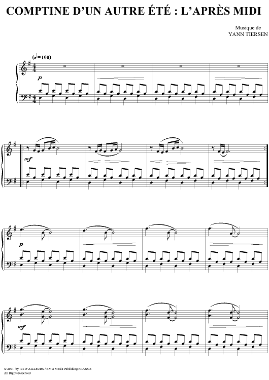 "Comptine d’un autre été L’après midi" Sheet Music by Yann Tiersen