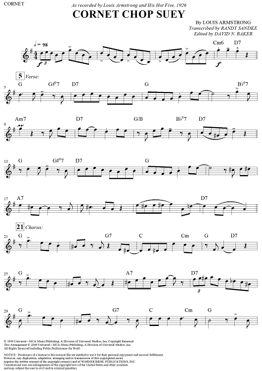 Digital Sheet Music for Cornet Chop Suey - Cornet by , Louis Armstrong, Louis Armstrong and His Hot Five scored for Jazz Ensemble; id:308476