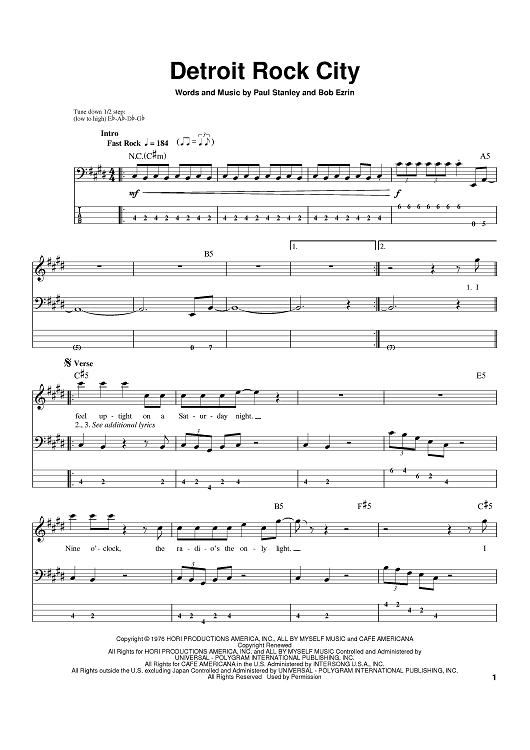 Digital Sheet Music for Detroit Rock City by Paul Stanley, Bob Ezrin, KISS scored for Bass Tab; id:388549