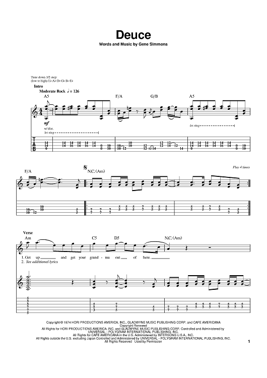 Digital Sheet Music for Deuce by Gene Simmons, KISS scored for Guitar Tab; id:384689