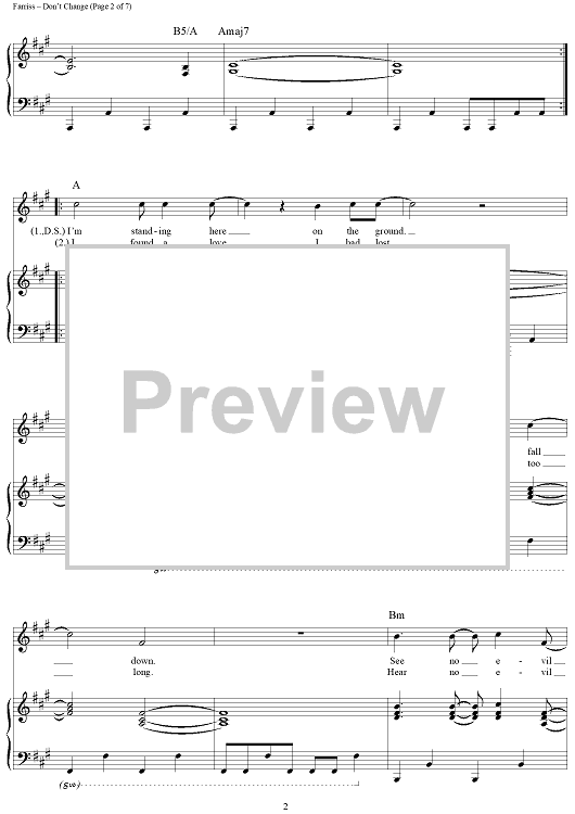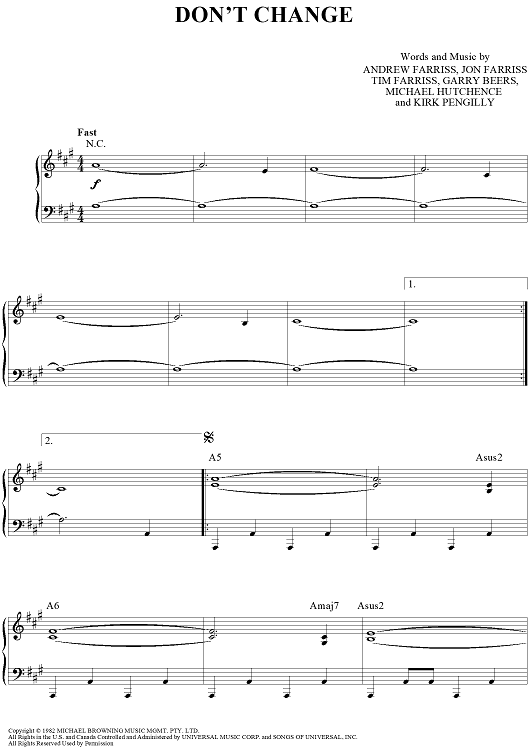 Digital Sheet Music for Don't Change by INXS, Andrew Farriss, Michael Hutchence, Garry Beers, Jon Farriss, Tim Farriss, Kirk Pengilly scored for Piano/Vocal/Chords; id:379174