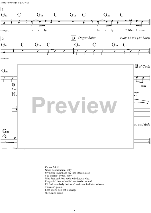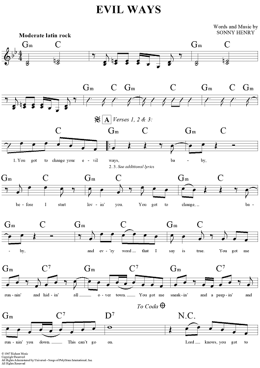 Digital Sheet Music for Evil Ways by Sonny Henry scored for Lead Sheet; id:293905