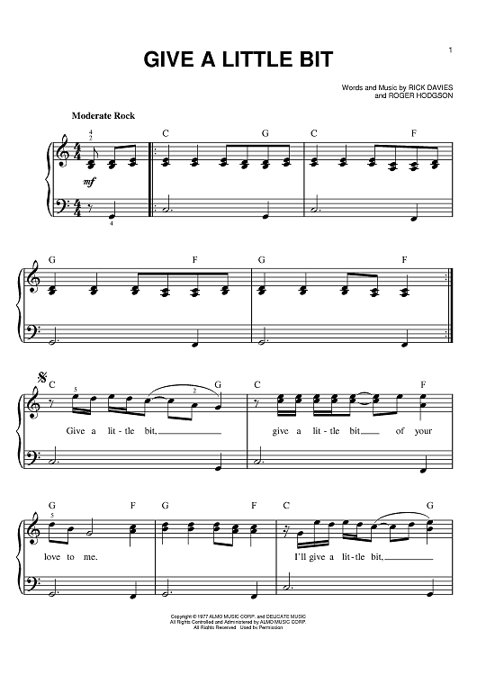 Digital Sheet Music for Give A Little Bit by Rick Davies, Roger Hodgson, Goo Goo Dolls, Supertramp scored for Easy Piano; id:384858
