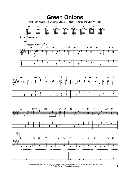 Digital Sheet Music for Green Onions by Booker T. Jones, Lewis Steinberg, The Ventures, Al Jackson Jr, Booker T. & The MG's scored for Easy Guitar Tab; id:371226