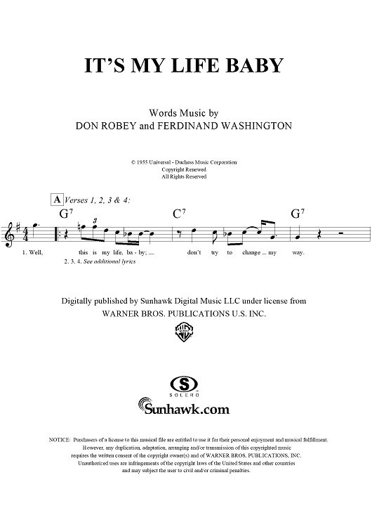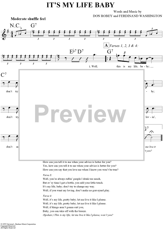 Digital Sheet Music for It's My Life Baby by Don Robey, Ferdinand Washington scored for Lead Sheet; id:291404