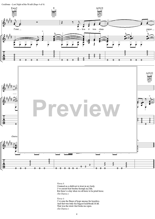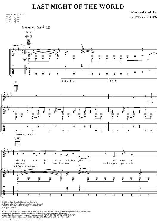 Digital Sheet Music for Last Night of the World by Bruce Cockburn scored for Guitar Tab/Vocal; id:292087