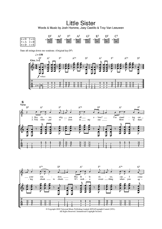 Digital Sheet Music for Little Sister by Joey Castillo, Josh Homme, Queens of the Stone Age, Troy Van Leeuwen scored for Guitar Tab; id:385433