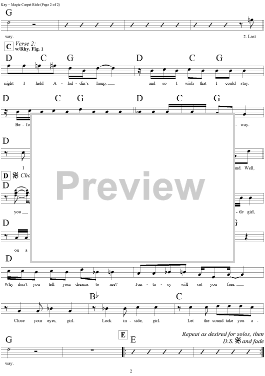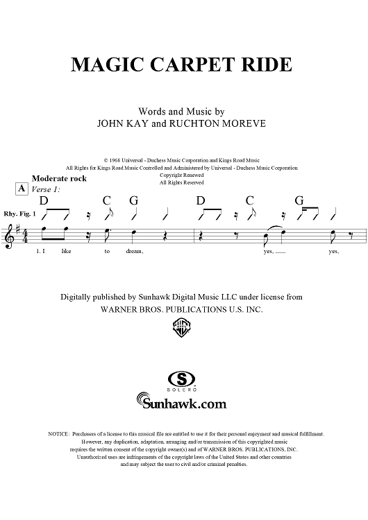 Digital Sheet Music for Magic Carpet Ride by Steppenwolf, John Kay, Rushton Moreve scored for Lead Sheet; id:294001