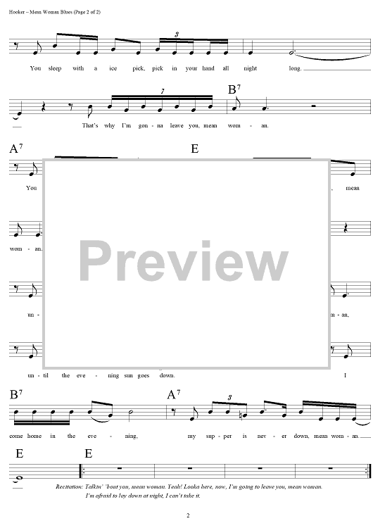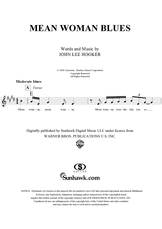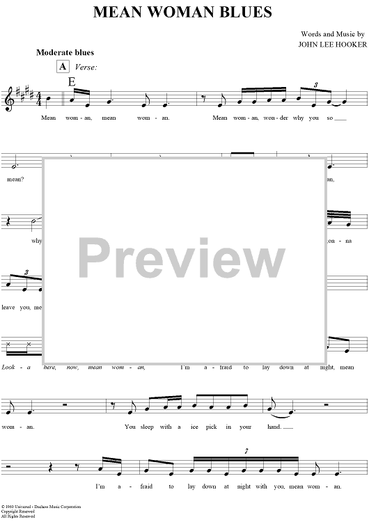 "Mean Woman Blues" Sheet Music by John Lee Hooker