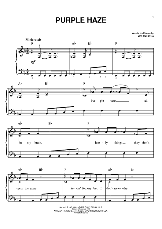 Digital Sheet Music for Purple Haze by Jimi Hendrix scored for Easy Piano; id:380480