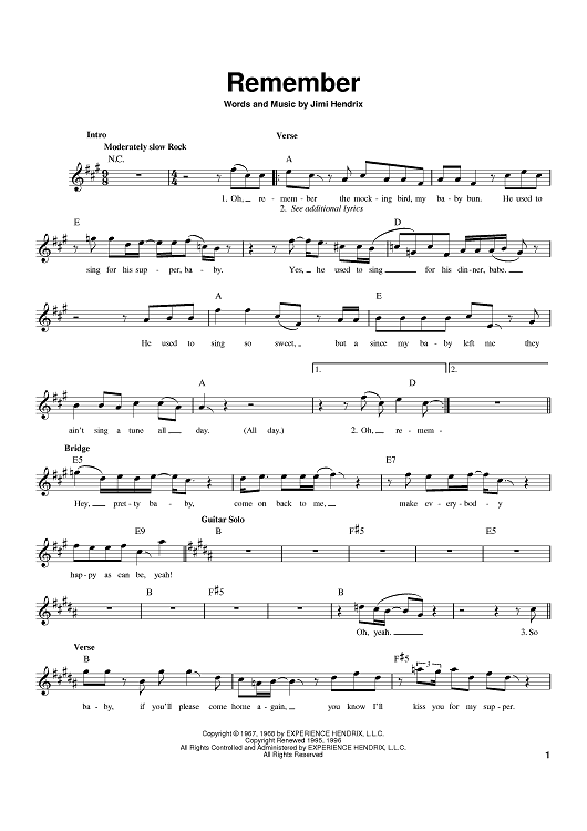 Digital Sheet Music for Remember by Jimi Hendrix scored for Lead Sheet; id:374322