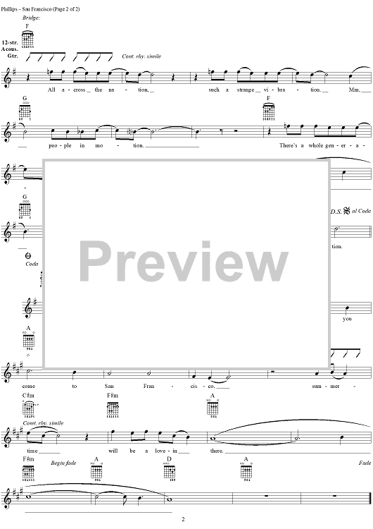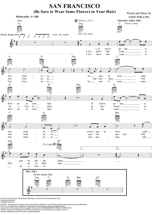 Digital Sheet Music for San Francisco by Scott McKenzie, John Phillips scored for Easy Guitar/Vocal; id:240339