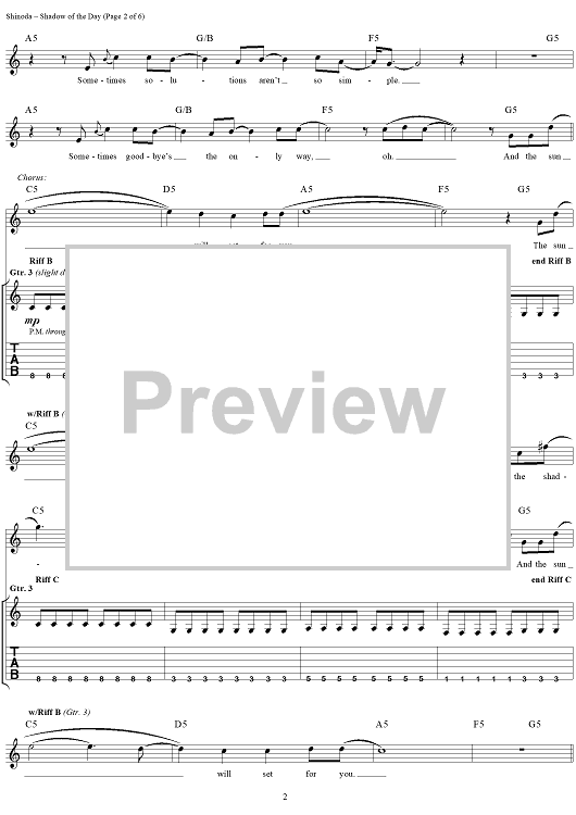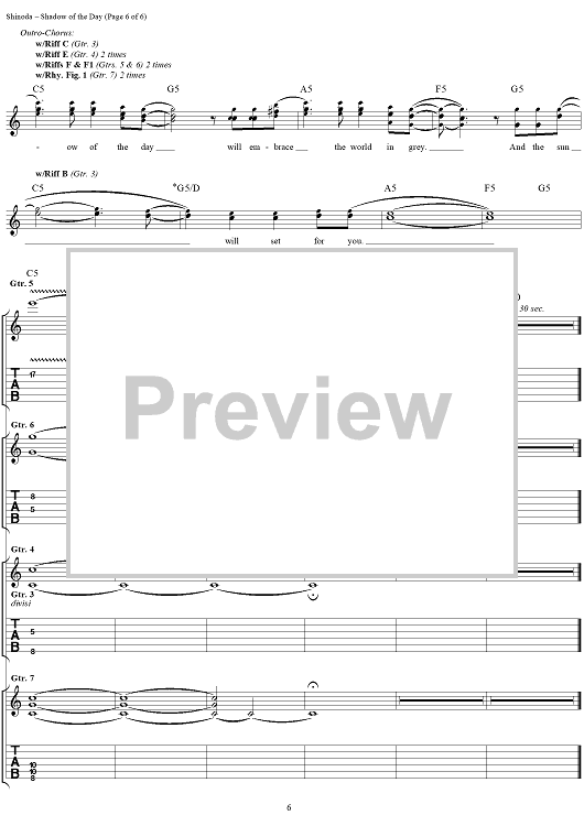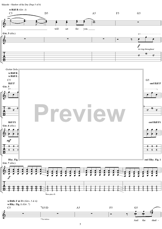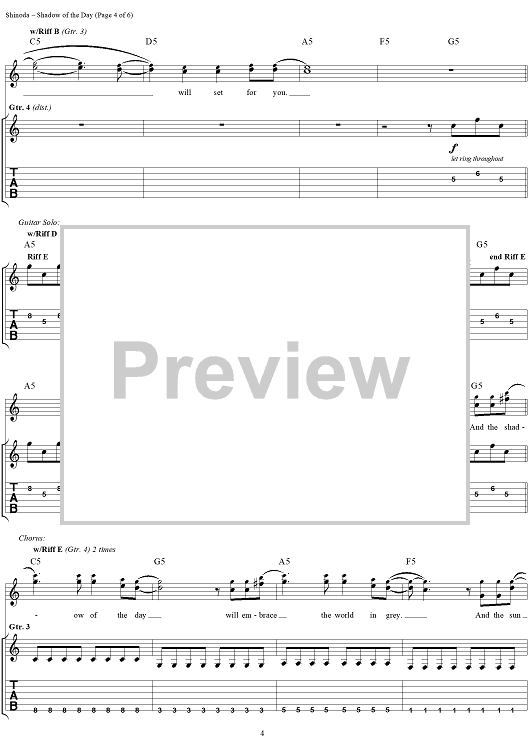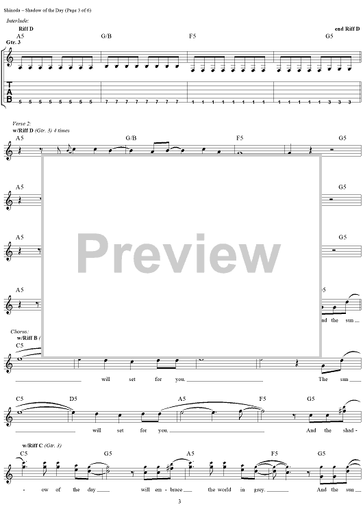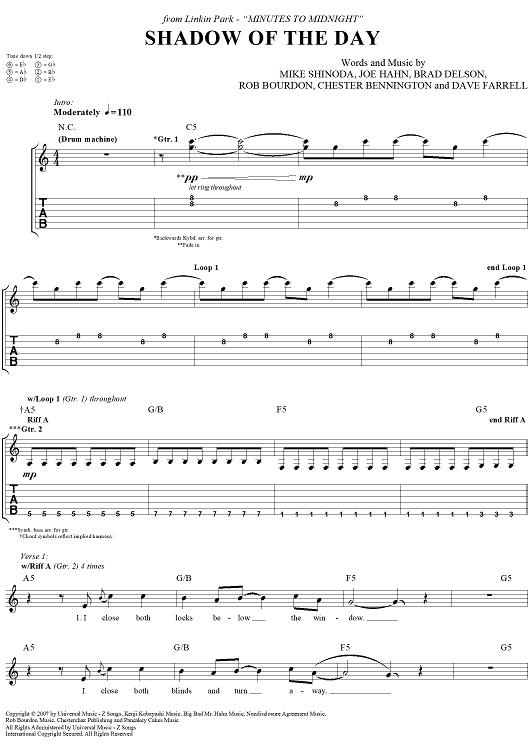 Digital Sheet Music for Shadow of the Day by Linkin Park, Dave Farrell, Mike Shinoda, Joe Hahn, Brad Delson, Rob Bourdon, Chester Bennington scored for Guitar Tab/Vocal/Chords; id:366946