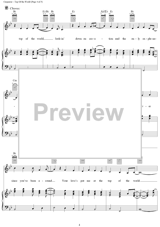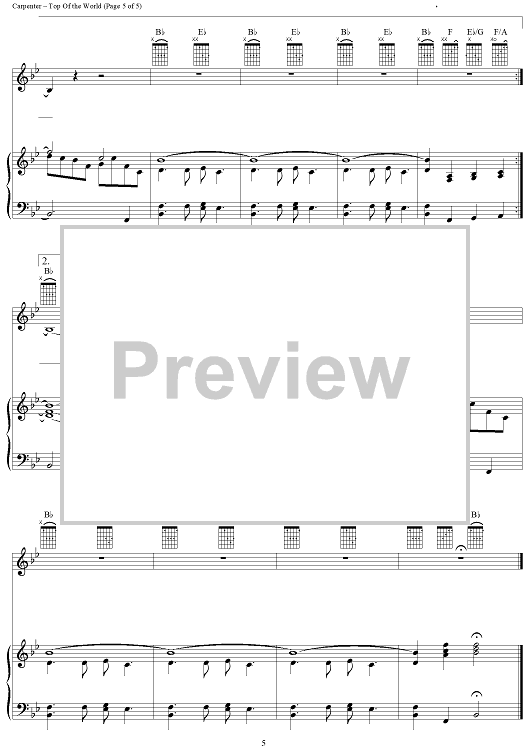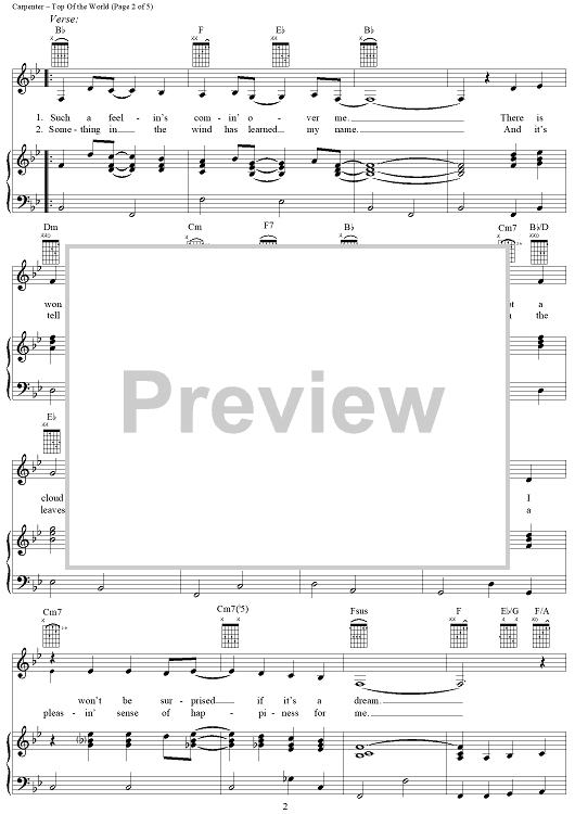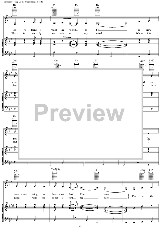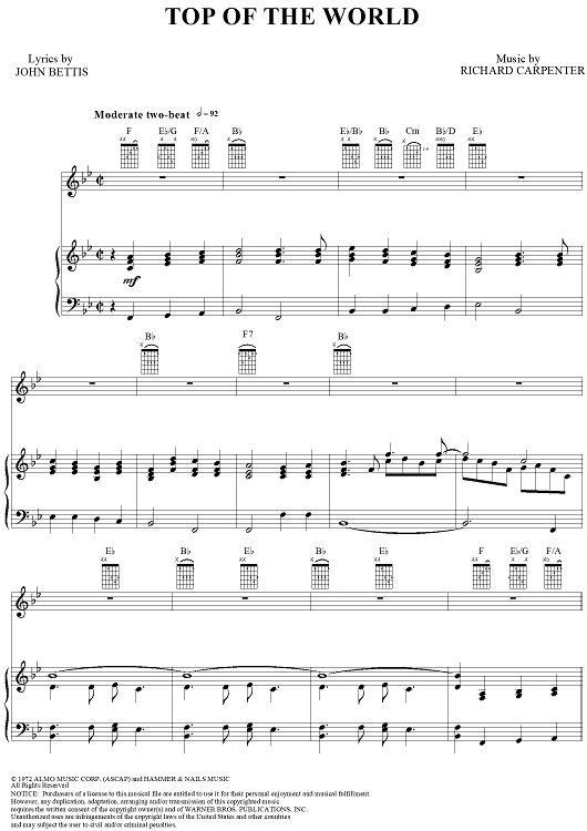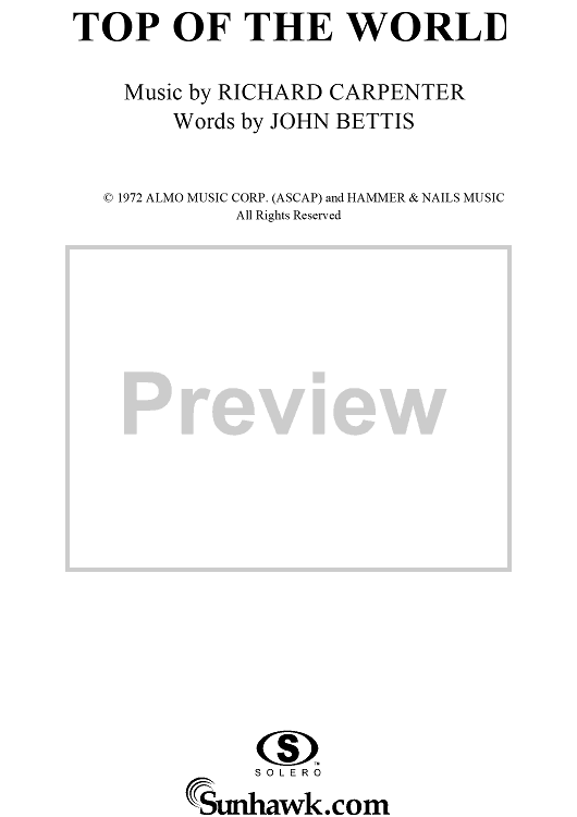 Digital Sheet Music for Top of the World by The Carpenters, Richard Carpenter, John Bettis scored for Piano/Vocal/Chords; id:113011
