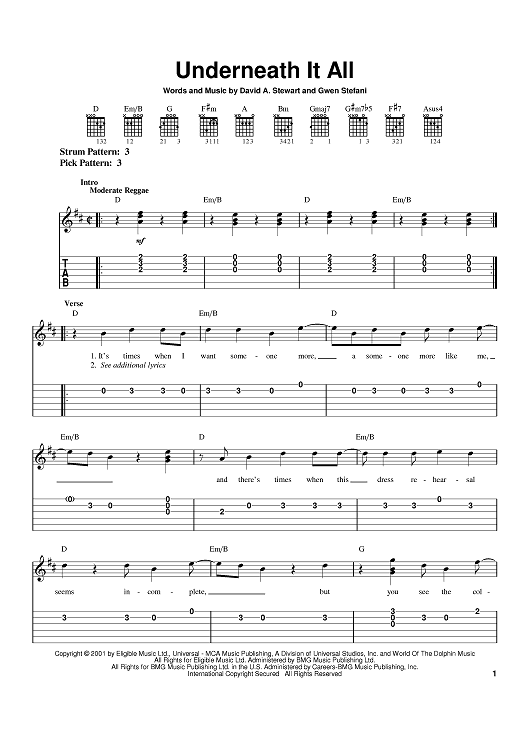 Digital Sheet Music for Underneath It All by Dave Stewart, No Doubt, Gwen Stefani scored for Easy Guitar Tab; id:371488