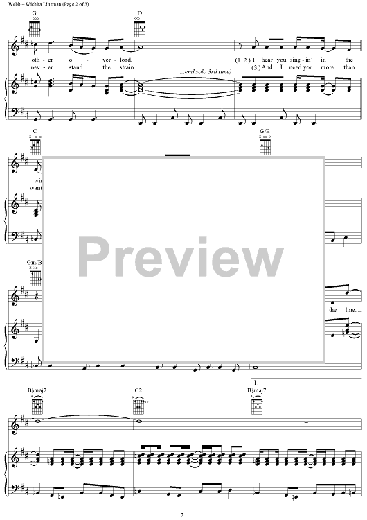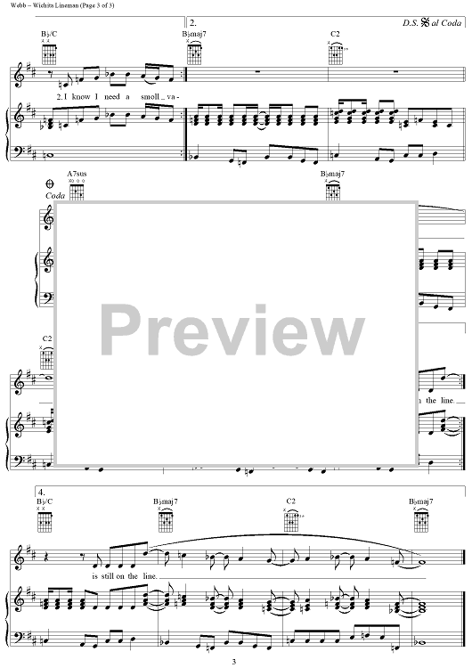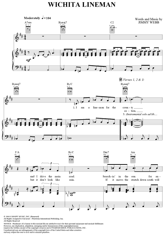 Digital Sheet Music for Wichita Lineman by Glen Campbell, Jimmy Webb scored for Piano/Vocal/Chords; id:307437