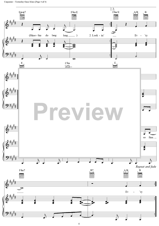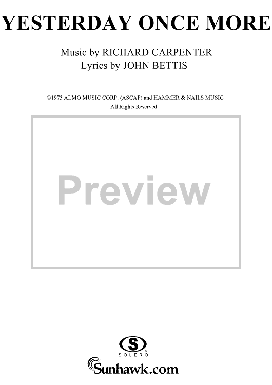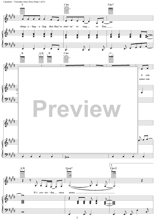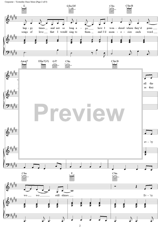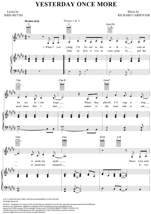 Digital Sheet Music for Yesterday Once More by The Carpenters, Richard Carpenter, John Bettis scored for Piano/Vocal/Chords; id:119248