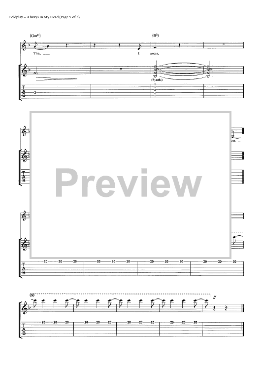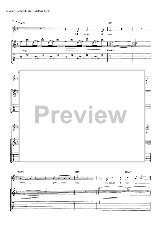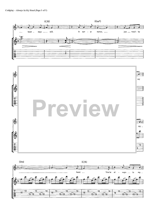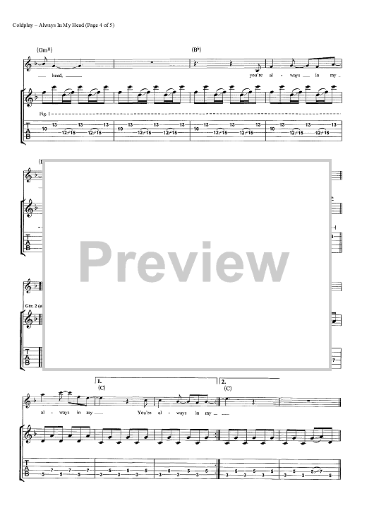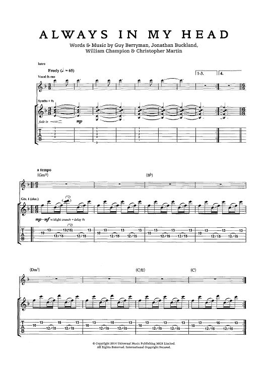 Digital Sheet Music for Always In My Head by Chris Martin, Coldplay, Jonny Buckland, Guy Berryman scored for Guitar Tab; id:444609