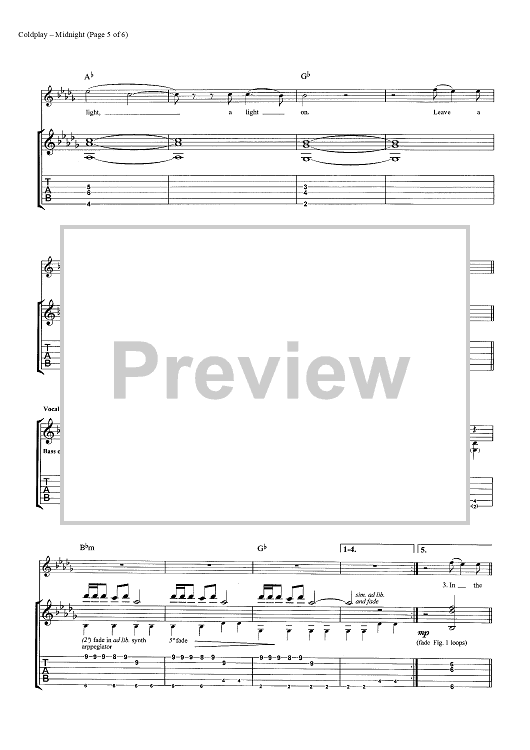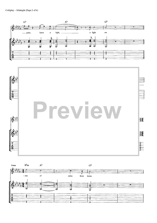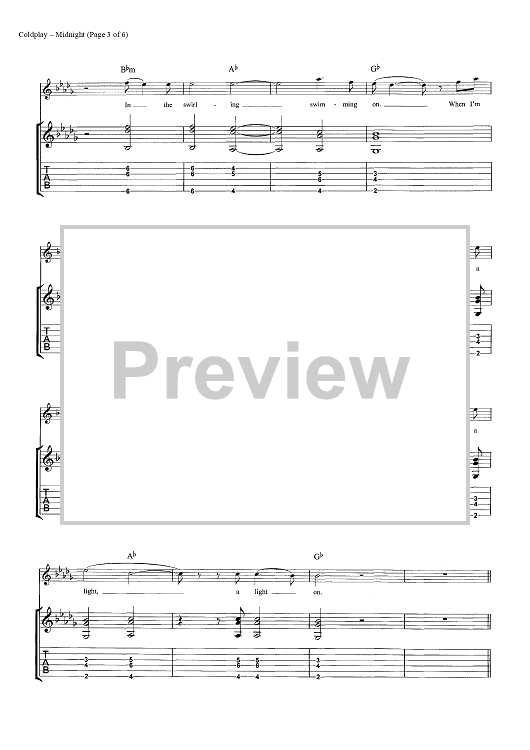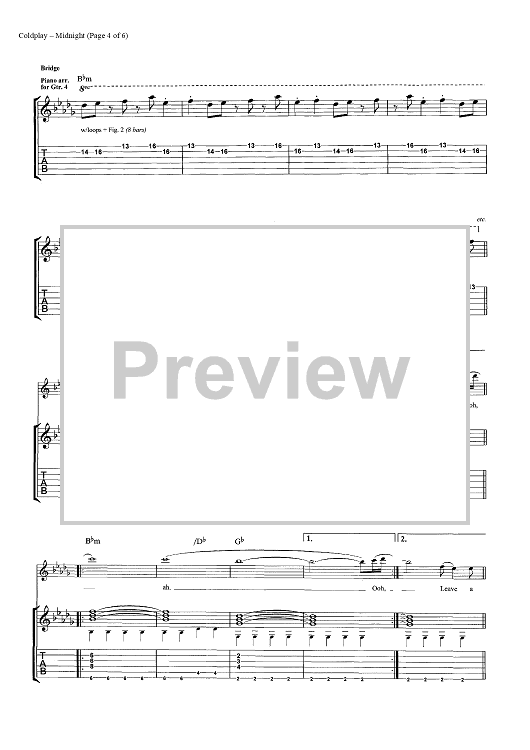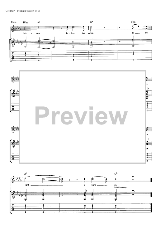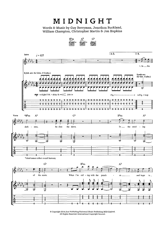 Digital Sheet Music for Midnight by Chris Martin, Coldplay, Jonny Buckland, Guy Berryman, John Henry Hopkins scored for Guitar Tab; id:444612
