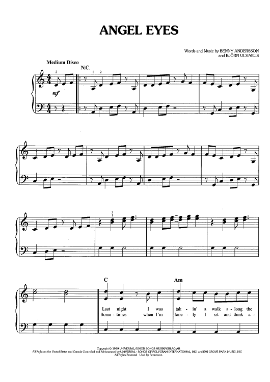 Digital Sheet Music for Angel Eyes - from Mamma Mia! Here We Go Again by ABBA, Benny Andersson, Bjorn Ulvaeus scored for Easy Piano/Vocal/Chords; id:466776