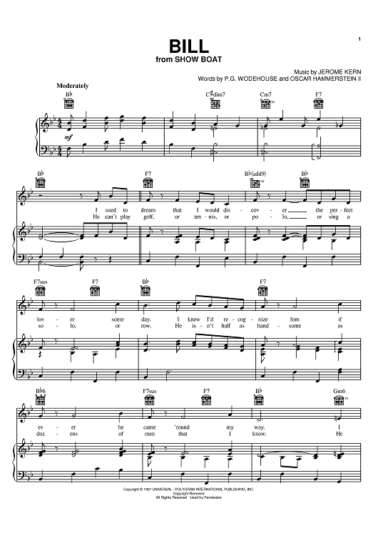 Digital Sheet Music for Bill by Jerome Kern, Oscar Hammerstein II, P.G. Wodehouse, Helen Morgan scored for Piano/Vocal/Chords; id:380585