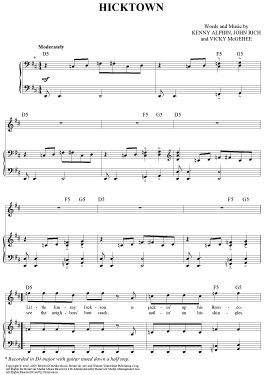 Digital Sheet Music for Hicktown by John Rich, Kenny Alphin, Vicky McGehee, Jason Aldean scored for Piano/Vocal/Chords; id:445049