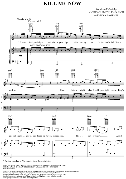 Digital Sheet Music for Kill Me Now by Anthony Smith, John Rich, Vicky McGehee, Rio Grand scored for Piano/Vocal/Chords; id:355293