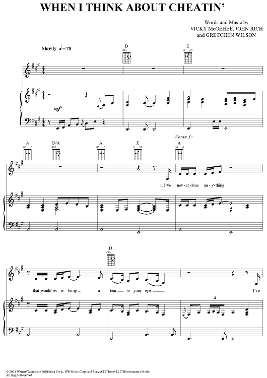 Digital Sheet Music for When I Think About Cheatin' by John Rich, Gretchen Wilson, Vicky McGehee scored for Piano/Vocal/Chords; id:308104