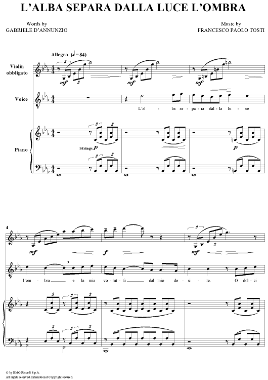 Digital Sheet Music for L'Alba Separa Dalla Luce L'Ombra by Andrea Bocelli, Gabriele d'Annunzio, Francesco Paolo Tosti scored for Piano/Vocal/Violin; id:296216