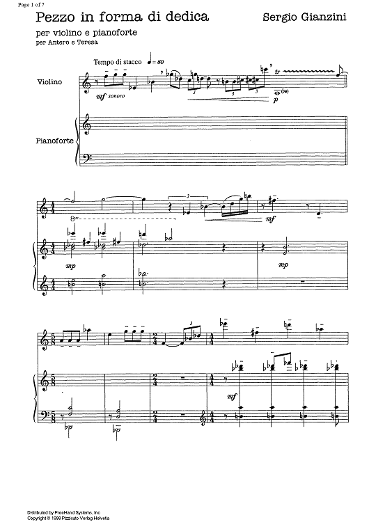 Digital Sheet Music for Pezzo in forma di dedica by , Sergio Gianzini scored for Violin/Piano; id:334318