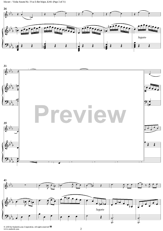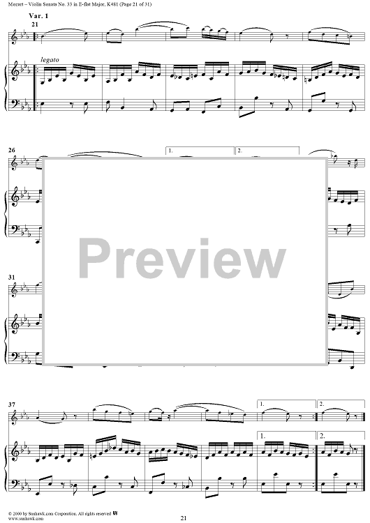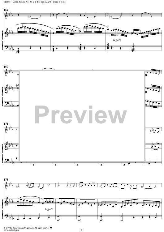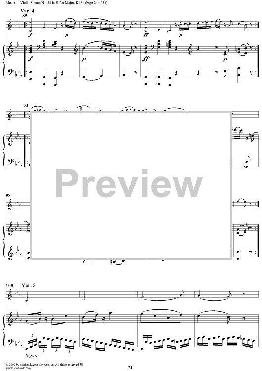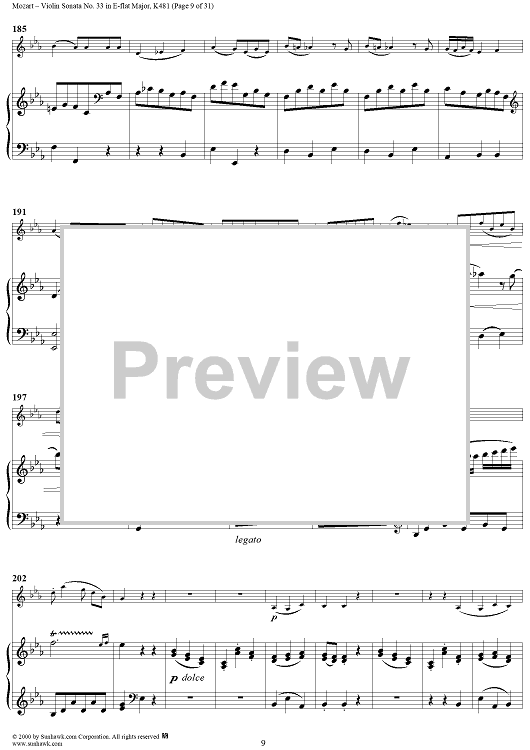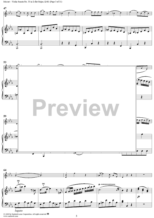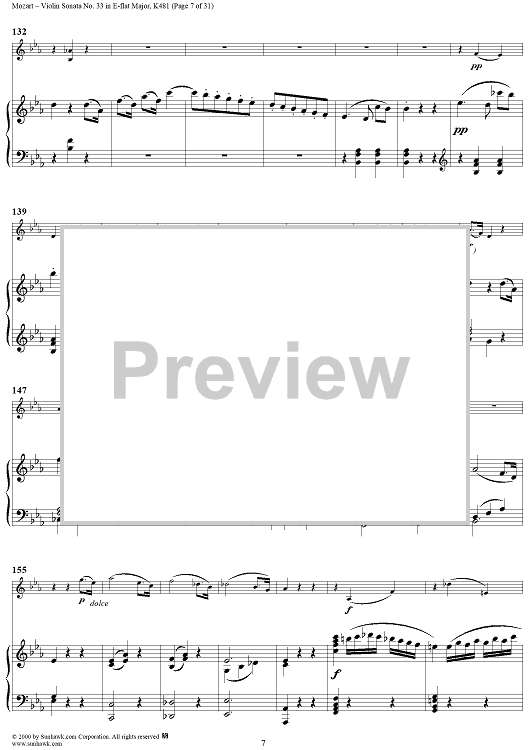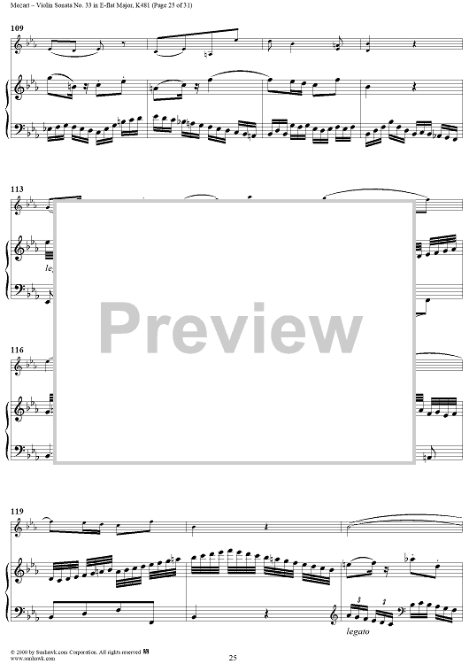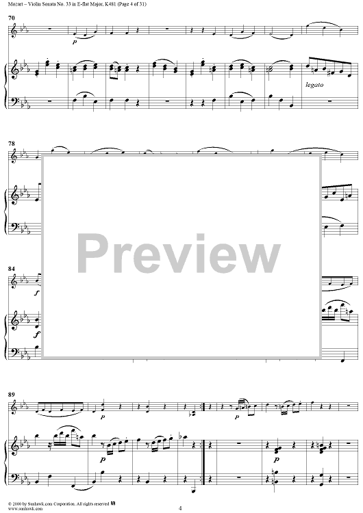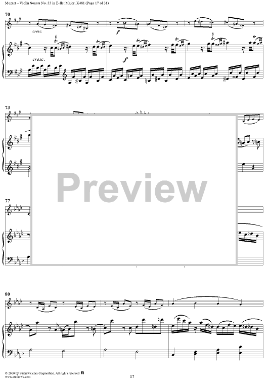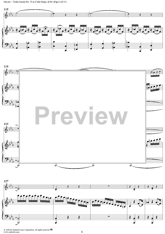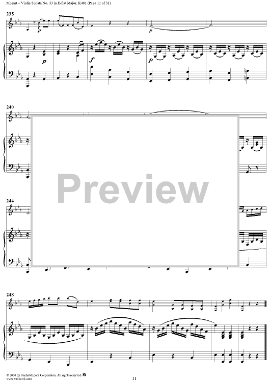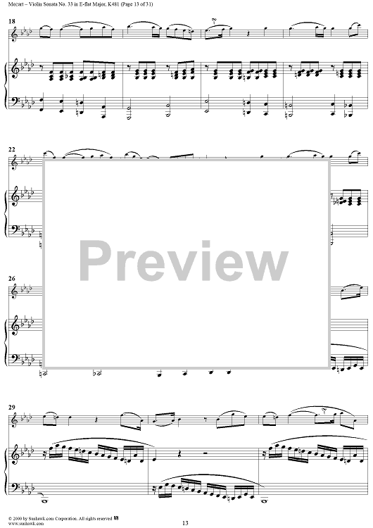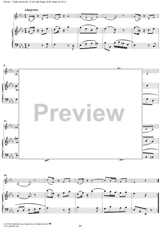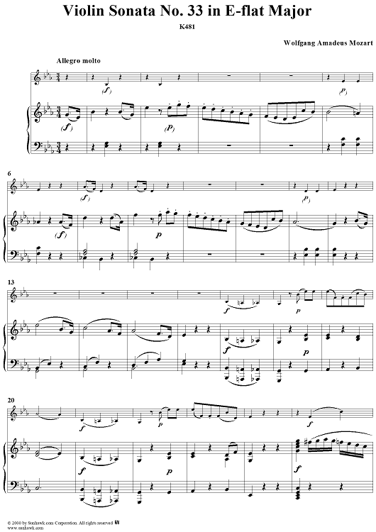 Digital Sheet Music for Violin Sonata No. 33 in E-flat Major, K481 - Full Score by Wolfgang Amadeus Mozart scored for Violin/Piano; id:253739