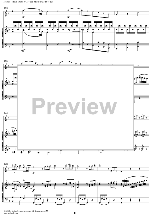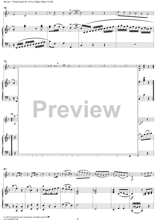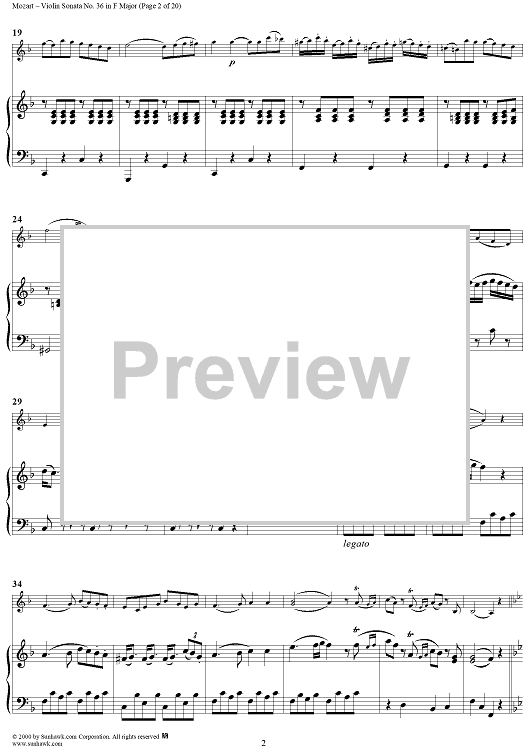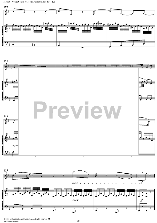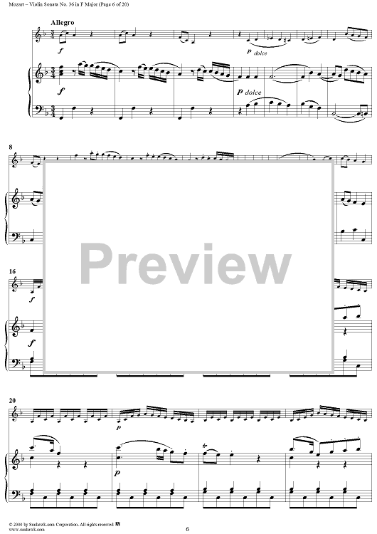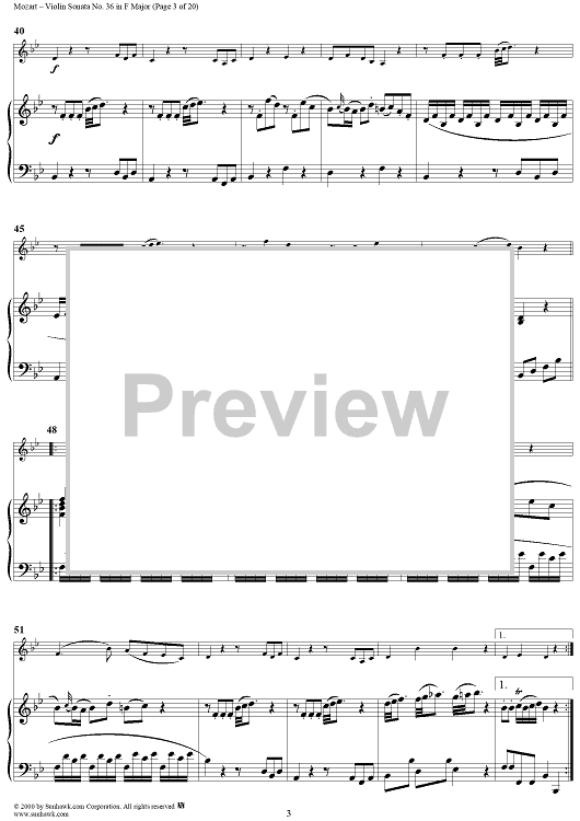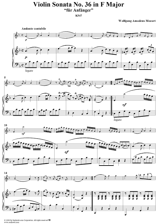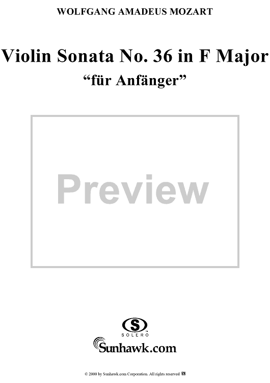 Digital Sheet Music for Violin Sonata No. 36 in F Major, "für Anfänger" - Full Score by Wolfgang Amadeus Mozart scored for Violin/Piano; id:256105