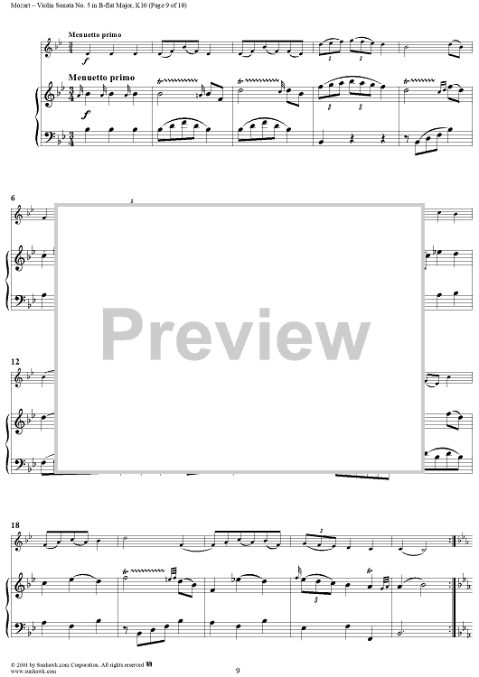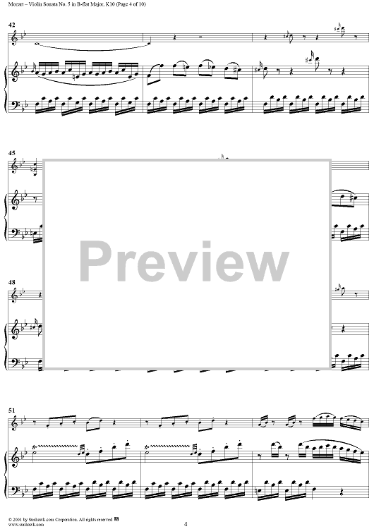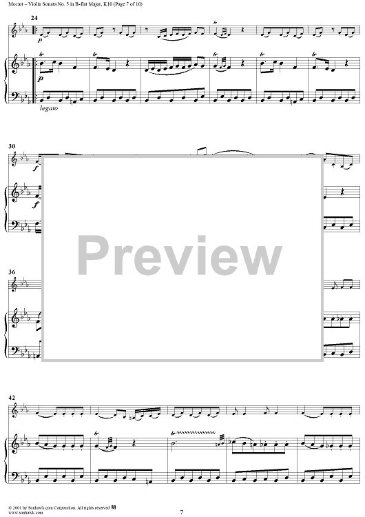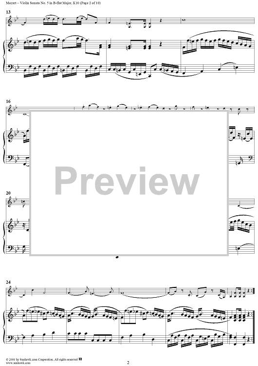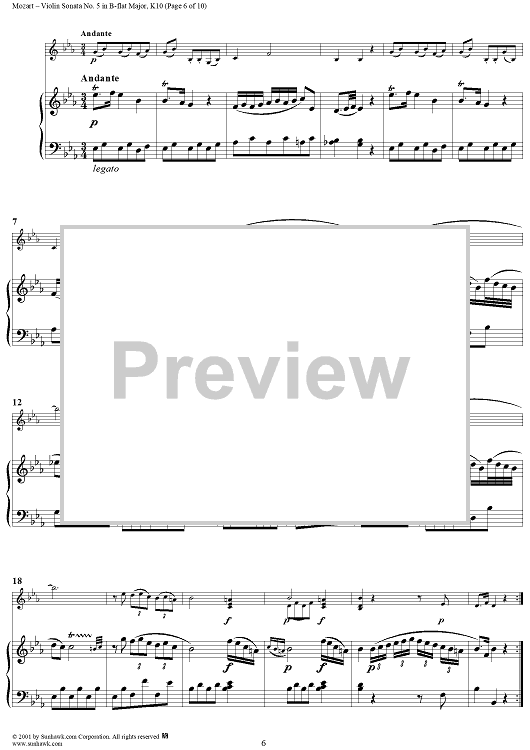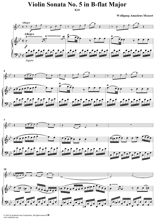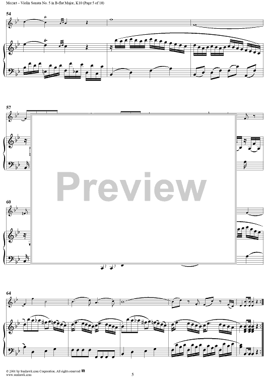 Digital Sheet Music for Violin Sonata No. 5 in B-flat Major, K10 - Piano Score by Wolfgang Amadeus Mozart scored for Violin/Piano; id:264937