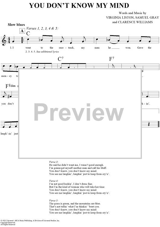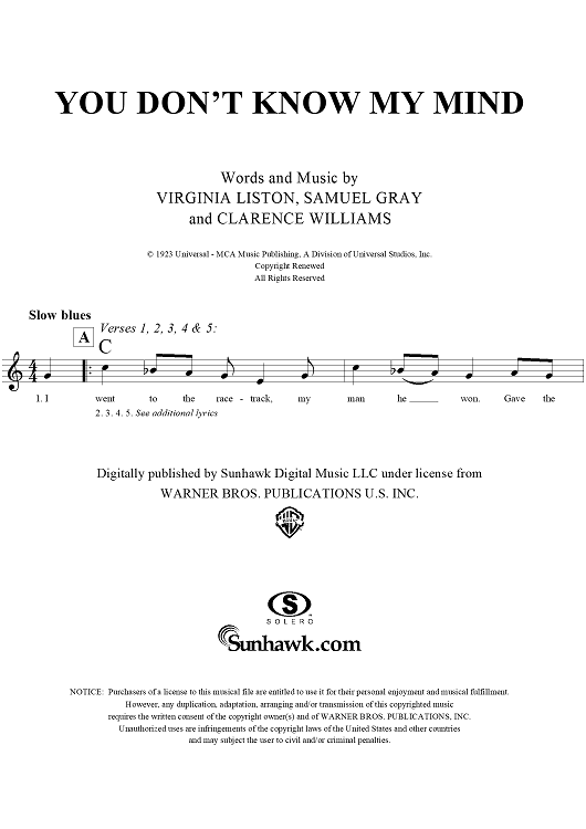 Digital Sheet Music for You Don't Know My Mind by Clarence Williams, Virginia Liston, Samuel Gray scored for Lead Sheet; id:291831